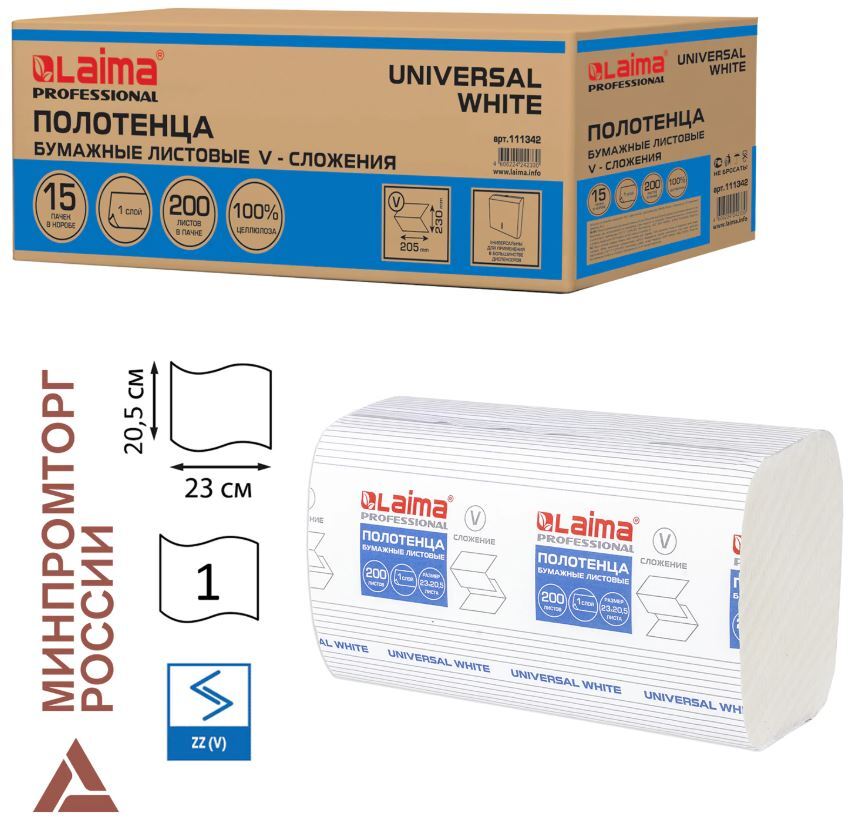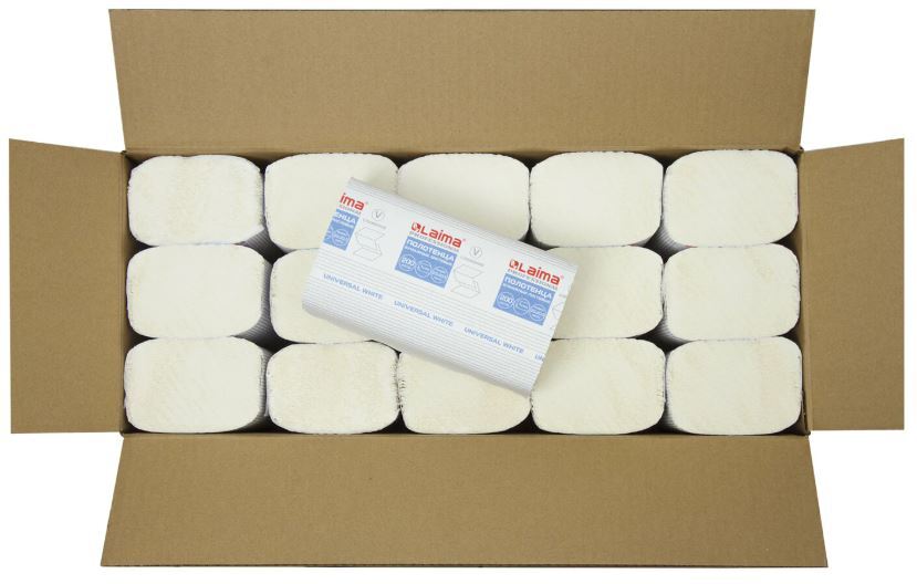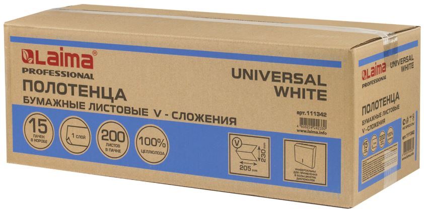 Бумажные полотенца "LAIMA Universal White" — оптимальное решение для кухни, дома и дачи. Белый цвет, однослойная структура, удобство использования обеспечивается формой V-сложения. Материал — 100%-я целлюлоза. Размеры одного листа 23x20,5 см. В упаковке 200 листов (короб содержит 15 упаковок). Подходит к большинству диспенсерных систем типа H3.